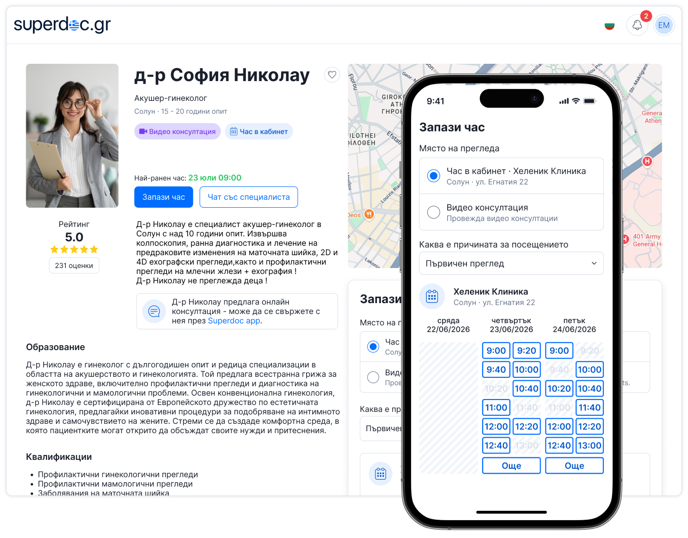 Superdoc е онлайн платформа за записване на медицински прегледи, която дава възможност на пациентите да разгледат профилите на лекари от различни специалности, да изберат най-подходящия лекар в най-удобното за тях време и място и да запазят час онлайн!